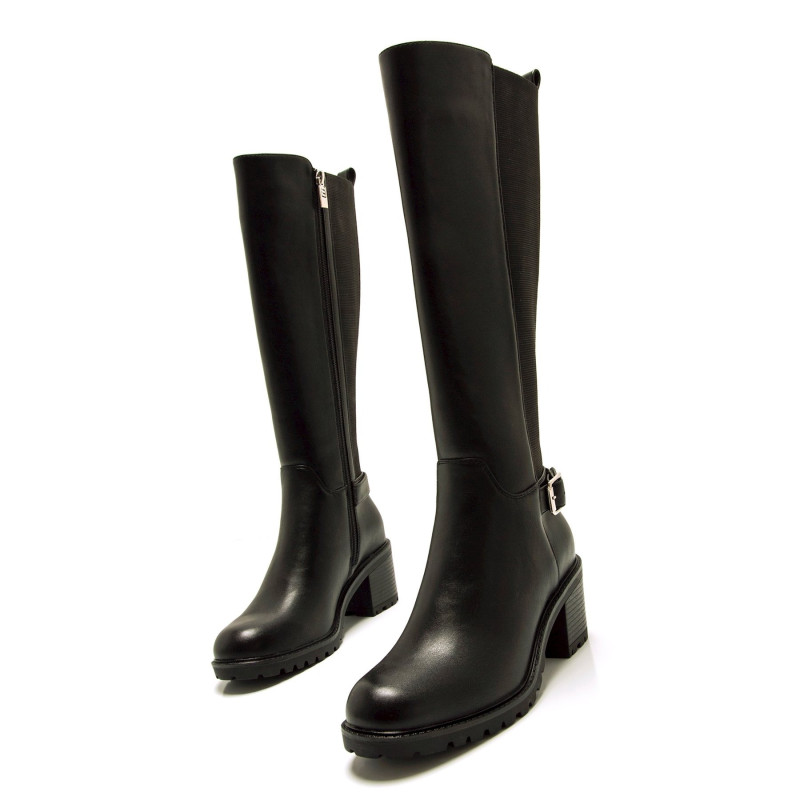 Les botes Mustang Maya per a dona en color negre combinen estil urbà i elegància amb una inspiració eqüestre, oferint un calçat versàtil i modern. La seva canya alta llisa, juntament amb la part posterior elàstica, proporciona un ajust còmode i segur, mentre que la sivella metàl·lica platejada decorativa al lateral aporta un toc sofisticat i actual. El taló ample i la sola amb relleu garanteixen estabilitat, bon agarri i comoditat durant tot el dia. Fabricades amb un 60% de cotó reciclat post consum i un 40% de cotó convencional, aquestes botes són una opció sostenible que combina estil, funcionalitat i respecte pel medi ambient. Perfectes per completar looks d’hivern sense renunciar a la practicitat ni a l’estil, les Mustang Maya destaquen pel seu disseny elegant i contemporani.