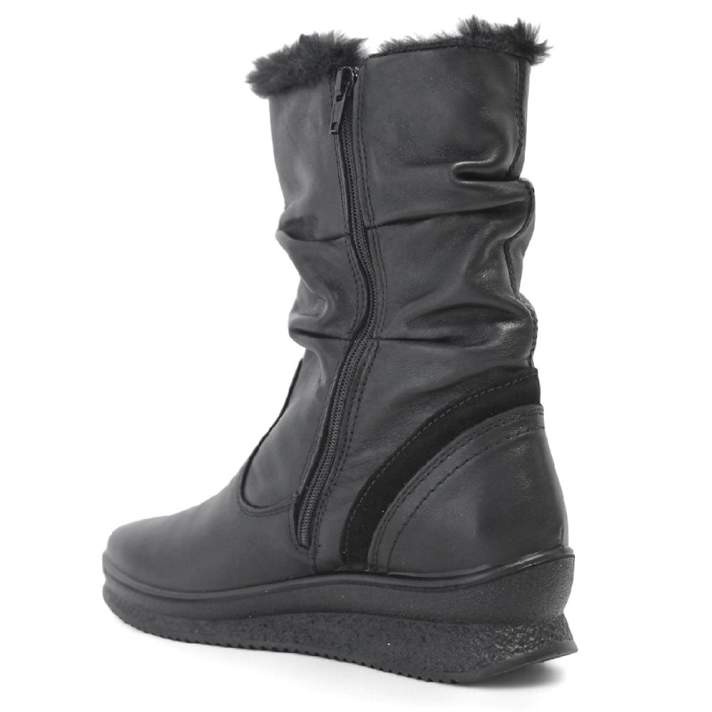 Botes planes per a dona Imac en color negre, confeccionades en pell d’alta qualitat. Presenten canya arrugada i folre interior de pel que aporta calidesa i comoditat. Incorpora cremallera lateral per a posar-se-les fàcilment i un panell de pell de serra decoratiu que afegeix un toc modern al disseny de pell llisa. Perfectes per a un look urbà i elegant durant la temporada freda.