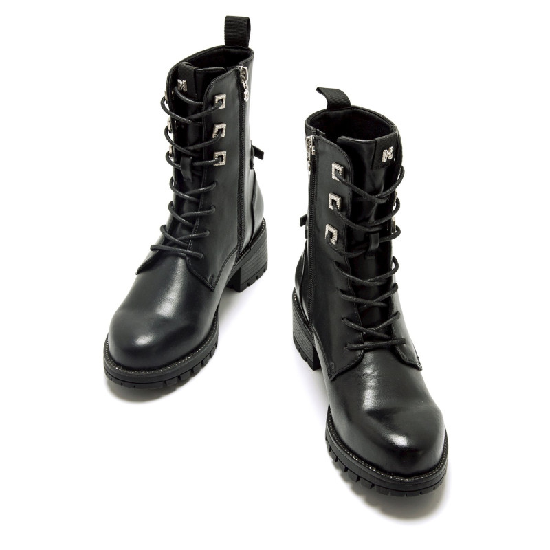 Els botins negres Mariamare Altea per a dona destaquen pel seu estil militar amb una estètica robusta i actual. Aquest model incorpora traus metàl·lics i un tancament de cordons que garanteix un ajust segur i personalitzat, aportant funcionalitat al disseny. La sola gruixuda amb relleu millora la tracció i el confort a cada passa, mentre que el taló baix i ample ofereix una gran estabilitat per al dia a dia. El detall de la sivella situada al taló afegeix un toc distintiu i modern que reforça el seu caràcter urbà. Versàtils i còmodes, aquests botins són ideals per completar looks desenfadats amb personalitat.
