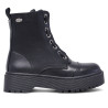Bota de plataforma d'estil militar per a dona de la selecció de Querol, en color negre, dissenyada amb una llengüeta intercanviable que permet portar-la amb cremallera o amb cordons segons es prefereixi. Amb el seu estil versàtil i funcional, és ideal per a looks urbans i moderns, oferint comoditat i un toc atrevit. Disponibles en diverses talles.