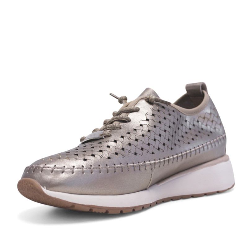 Les sabates esportives de pell metal·litzada per a dona combinen comoditat i estil en un disseny modern i versàtil. Aquest model en color ónix metal·litzat presenta un tall calat que aporta frescor i transpiració, ideal per portar durant tot el dia. El tancament amb elàstics facilita posar-les i s’adapta a tot tipus de turmells, mentre que el cosit a mà aporta un acabat elegant i d’alta qualitat amb un aire sport chic. La sola lleugera i flexible permet caminar durant hores sense esforç, oferint comoditat constant. Inclouen plantilla extraïble folrada en pell, que afegeix confort addicional i permet personalitzar l’ajust segons les necessitats. Perfecte per a qui busca sabates esportives còmodes, versàtils i amb un toc sofisticat.