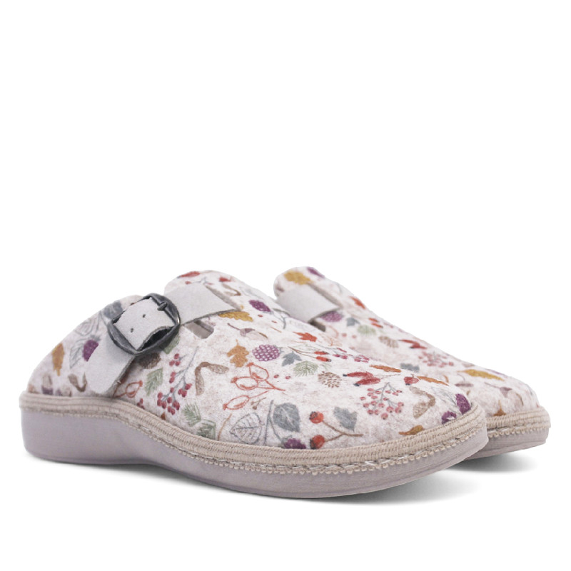 Sabatilles d’estar per casa per a dona Salvi model Pet en color sorra, amb un delicat estampat de fulles i fruits del bosc. Dissenyades obertes per darrere amb sivella lateral per un ajust còmode i pràctic. Fabricades en material tèxtil càlid i suau que ofereix confort durant tot el dia. La seva sola de goma antilliscant garanteix seguretat en cada pas. Perfectes per combinar estil i comoditat a casa.