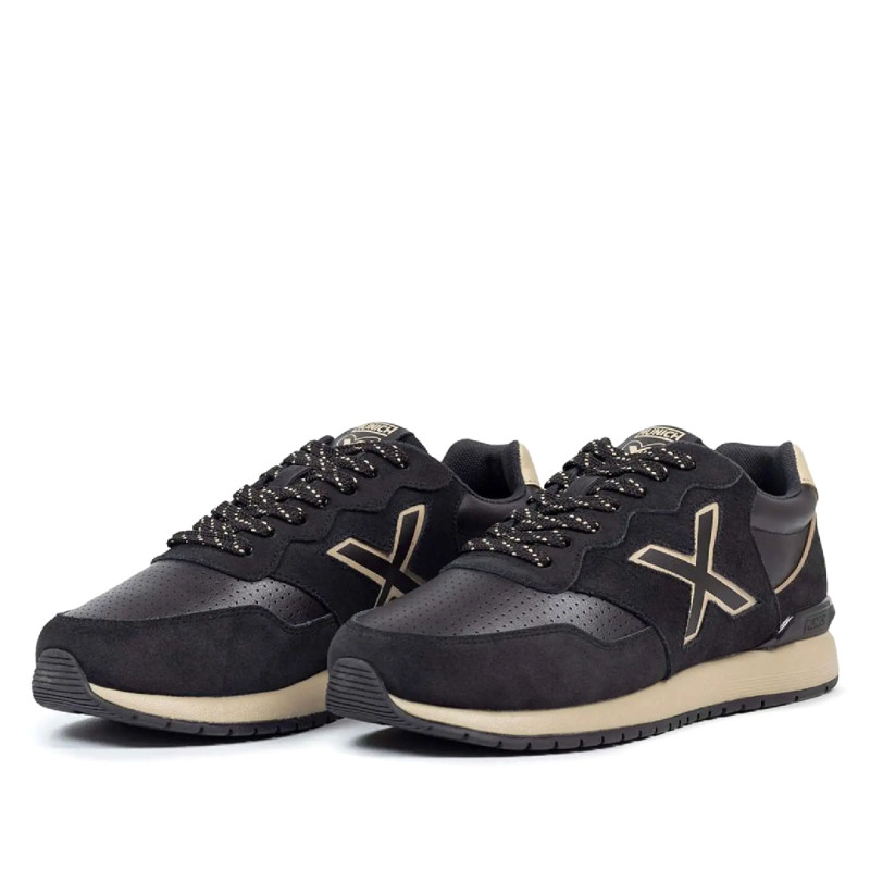 Les Zapatilles Munich Dash Premium en negre i beix combinen estil retro i comoditat moderna. Fabricades amb materials sintètics d'alta qualitat, compten amb una sola de cautxú i EVA que proporciona màxim agarri i resistència. El seu tancament amb cordons assegura un ajust perfecte, mentre que el logo bordat afegeix un toc distintiu. Ideals per a un look urbà i casual, són perfectes per al dia a dia.