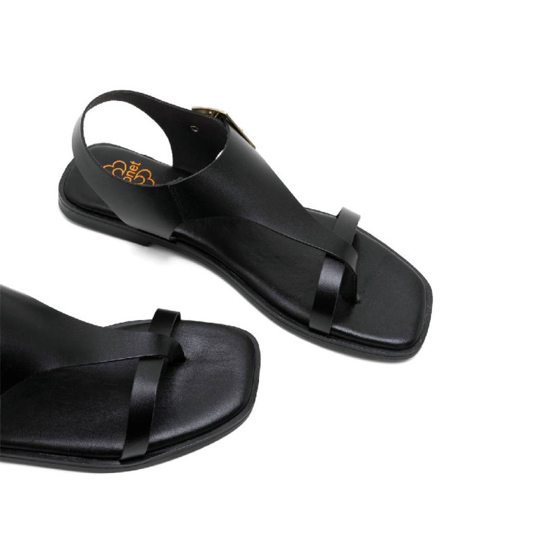 Les sandàlies planes Porronet, model Berta en color negre, estan fabricades en pell i disposen de plantilla de pell encoixinada que garanteix comoditat a cada pas. El seu disseny inclou una tira creuant la part superior del peu i un tancament amb sivella daurada quadrada al turmell, oferint un ajust segur i elegant. Perfectes per combinar amb looks casuals o més formals, mantenint estil i confort durant tot el dia.