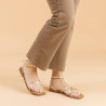 Sandàlia plana de pell amb tires fines creuades que aporten un estil minimalista i elegant, perfecta per als qui busquen senzillesa amb un toc sofisticat. El tancament amb corretja ajustable al turmell garanteix un ajust segur i còmode durant tot el dia. La seva plantilla de pell embuatada proporciona una trepitjada suau i confortable, ideal per a l'ús diari. Un model fabricat artesanalment a Espanya, que combina disseny, comoditat i qualitat en cada detall.