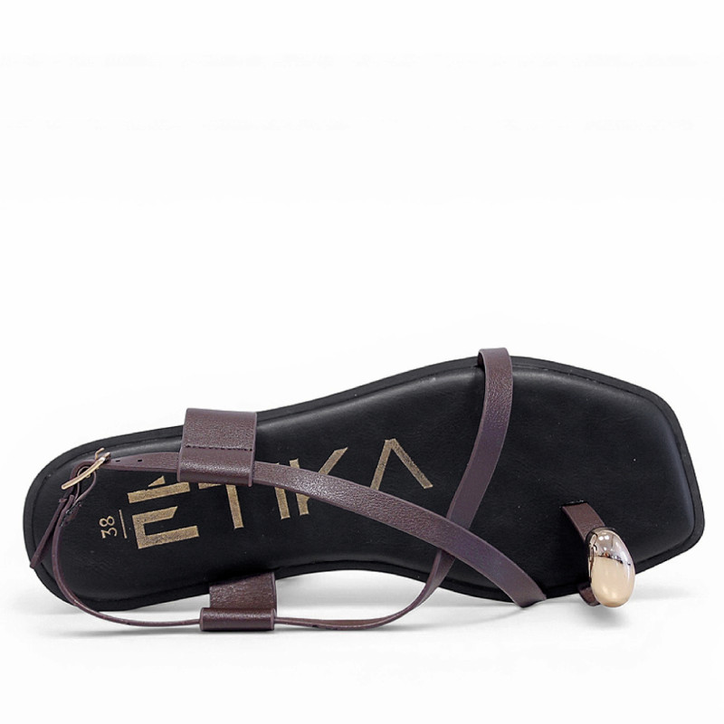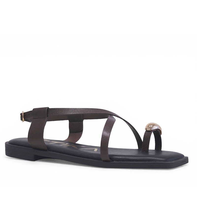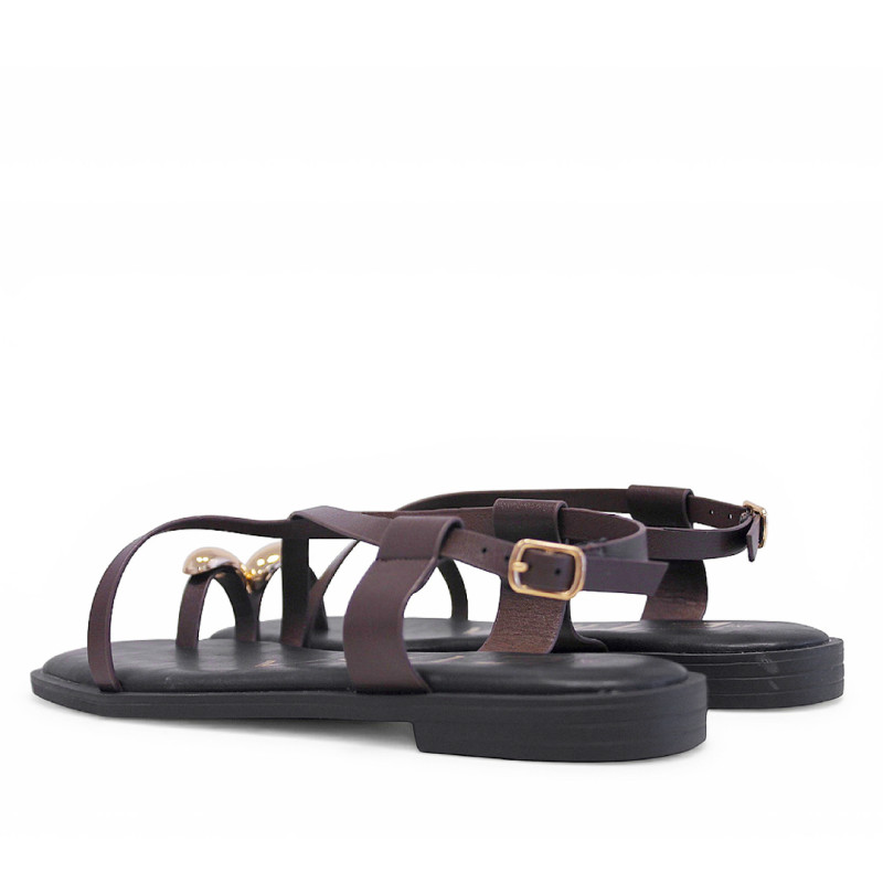 Sandàlies planes Querol marrons amb tires creuades i anell daurat al dit