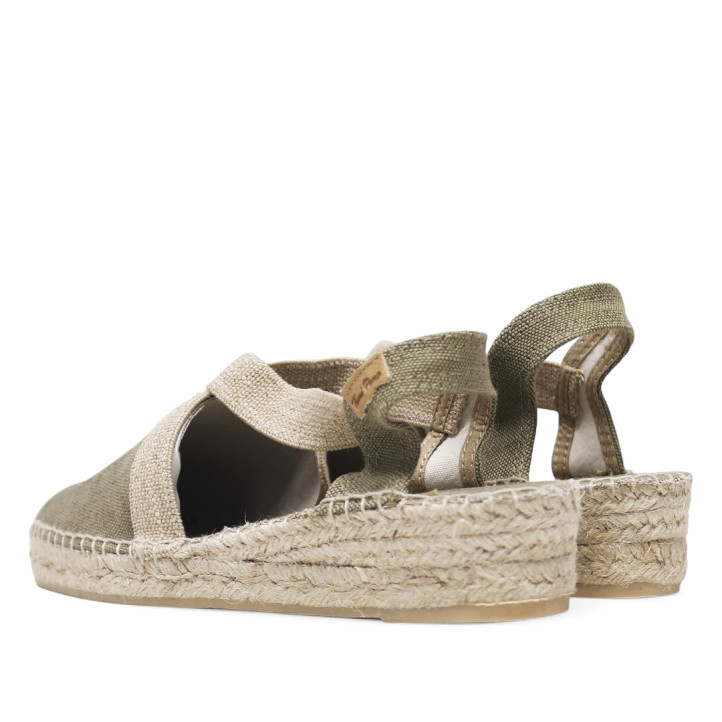 Alpargata vegana plana para mujer VERDI-V de Toni Pons en color verde. Confeccionada en tejido de algodón en tono liso, cuenta con una cuña de yute de 4 cm y suela de goma antideslizante. Incorpora dos tiras elásticas contrastadas que garantizan una sujeción óptima al pie. La plantilla interior forrada en tejido aporta mayor comodidad. Modelo vegano, cosido a mano en España. Calza la talla habitual; si estás entre dos tallas, se recomienda elegir la más grande.