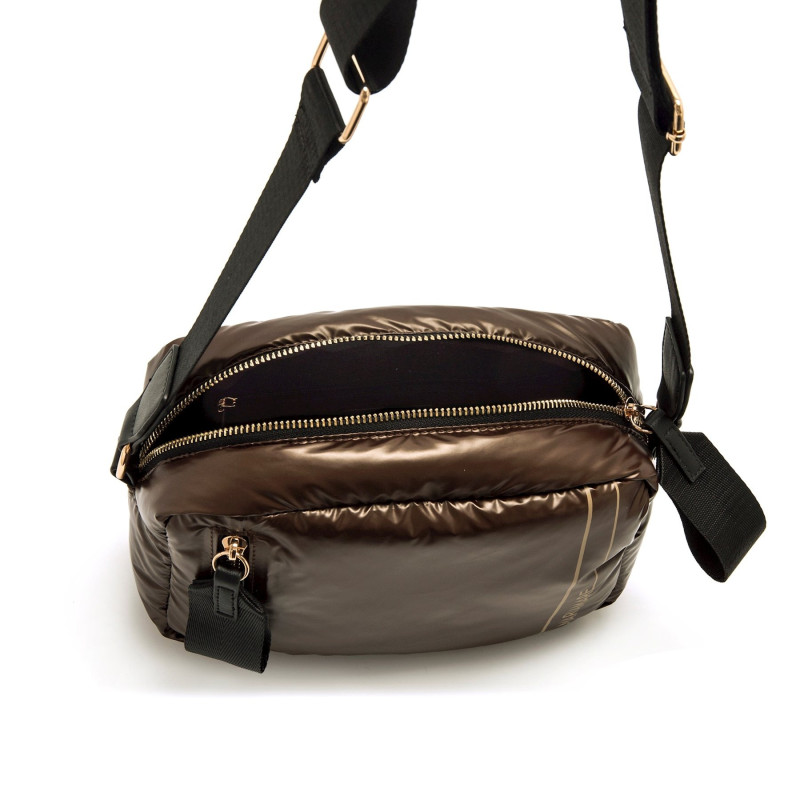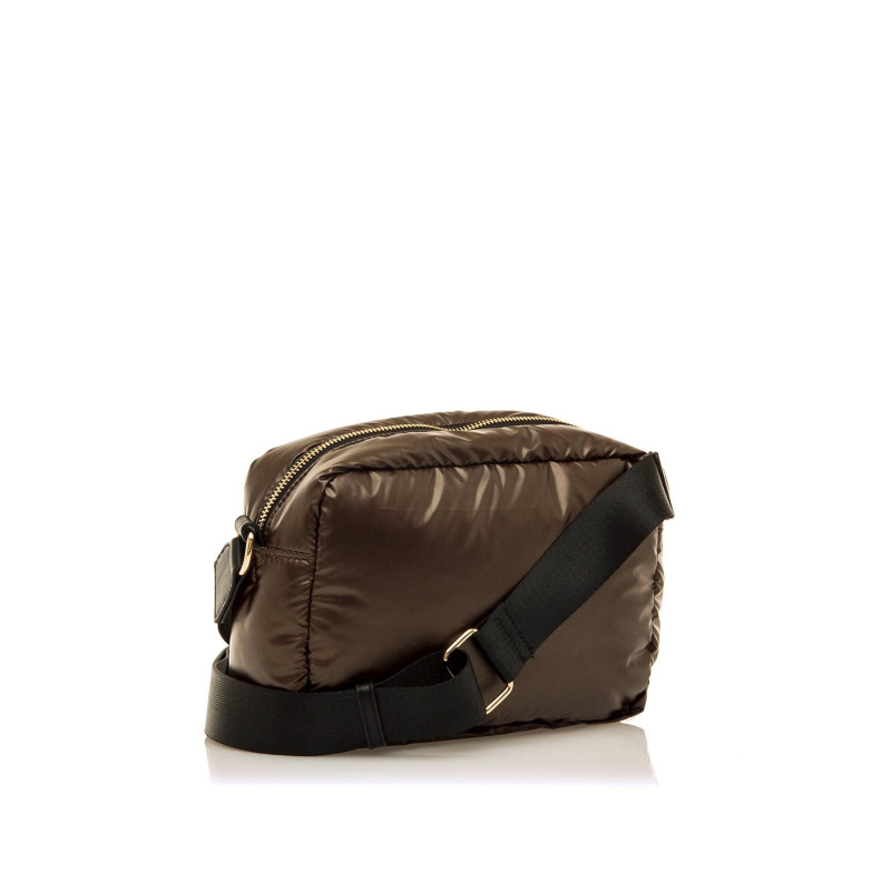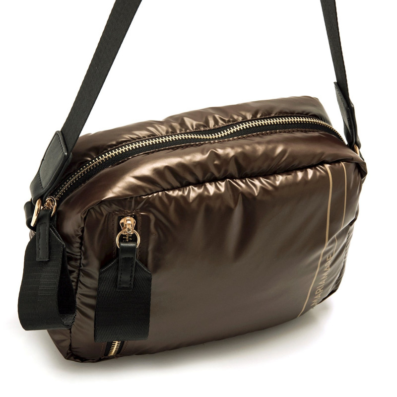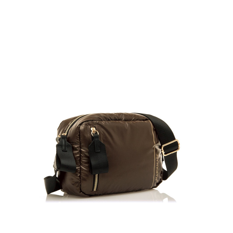Bandolera de color moka para mujer, modelo Aure de la marca Mariamare. Fabricada en nylon con acabado brillante, ofrece un diseño funcional y moderno para acompañarte en tus actividades diarias. Su compartimento principal con cremallera dorada y su b