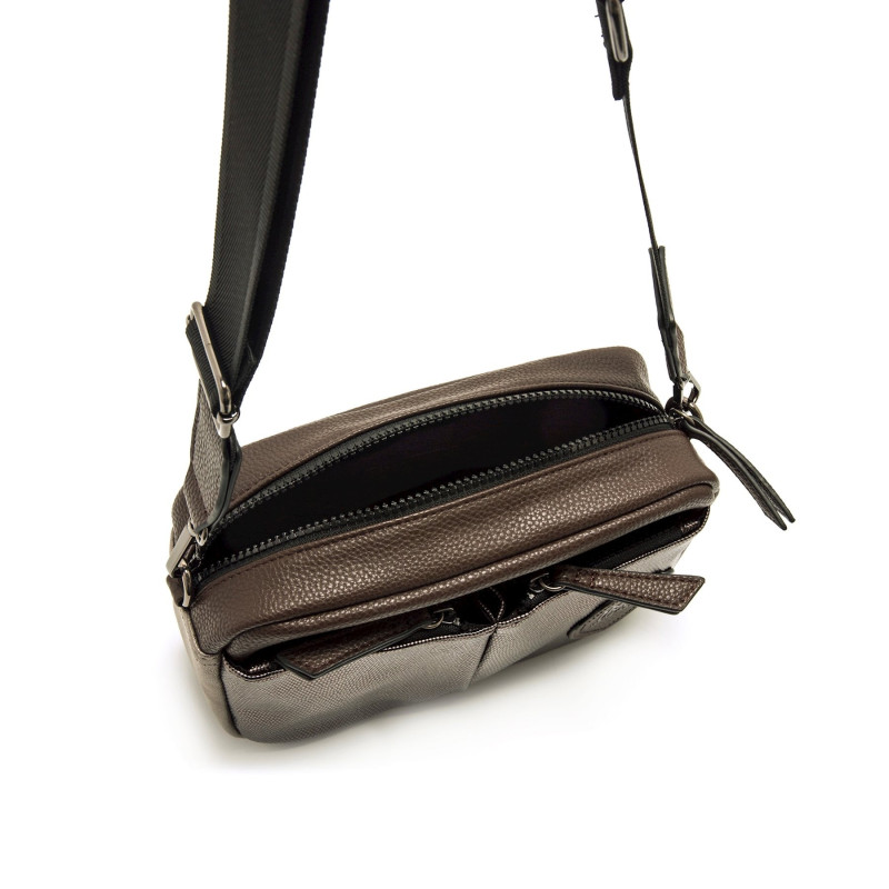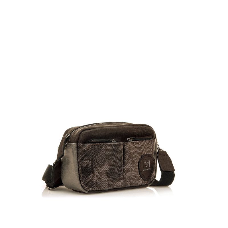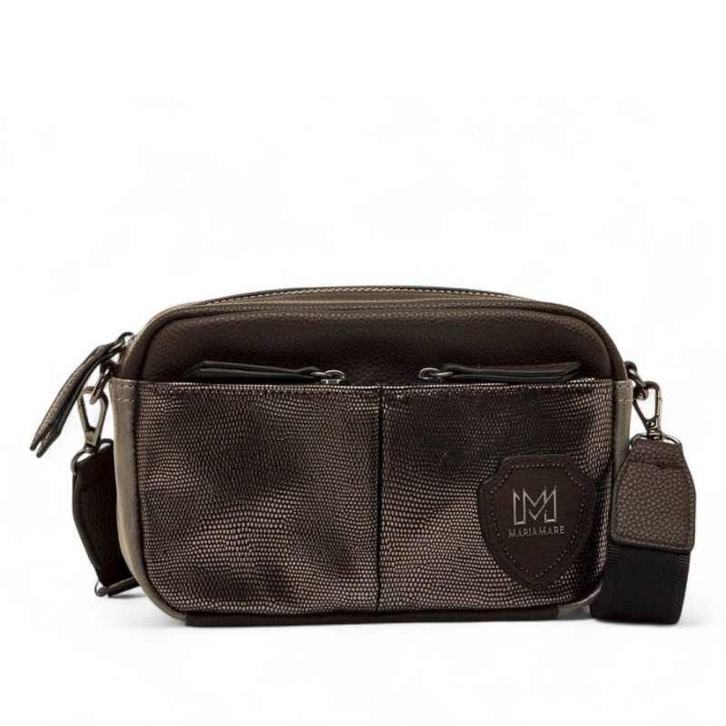 Bolso bandolera de color moka para mujer, modelo Nisi de Mariamare. Su diseño compacto y funcional incorpora dos bolsillos frontales en tono plomo metalizado con cierre de cremallera, ideal para tener a mano objetos pequeños. El cuerpo con textura ef