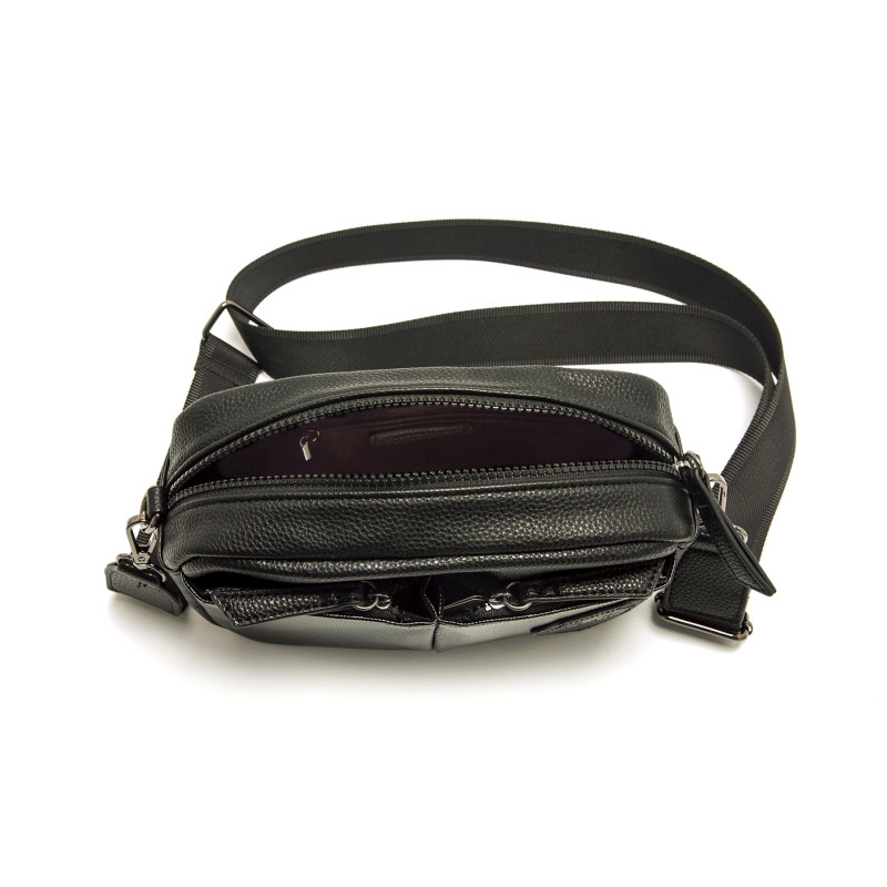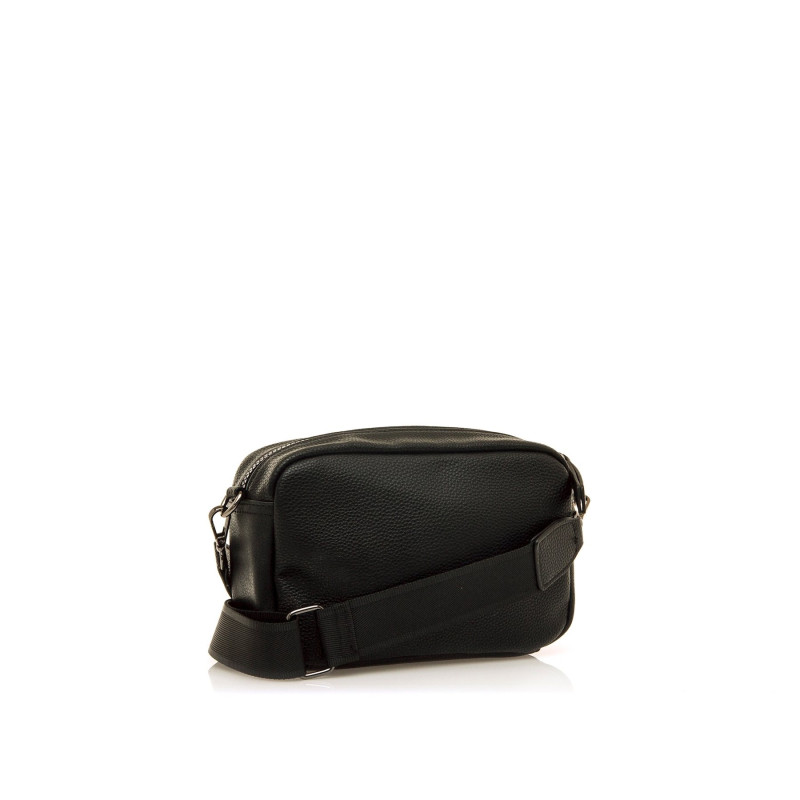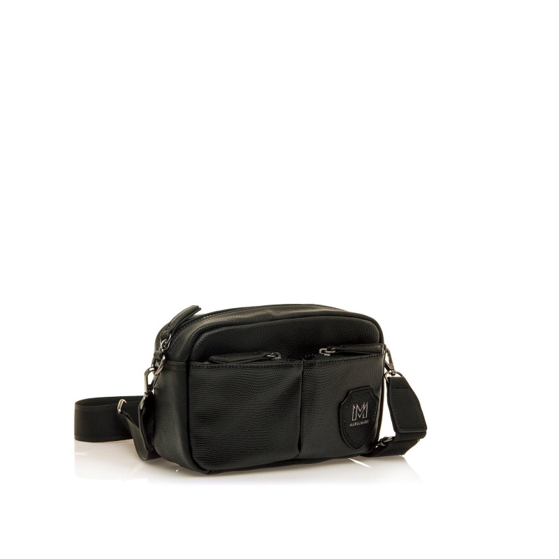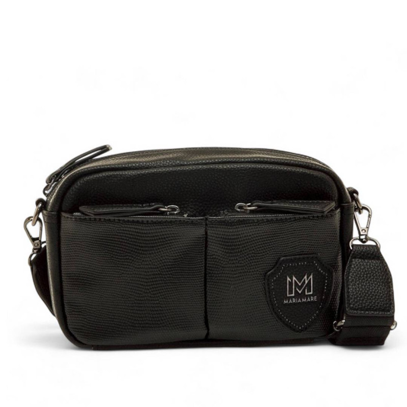 Bolso bandolera de color negro para mujer de Mariamare modelo Nisi. Su estructura compacta incluye dos bolsillos frontales texturizados con cremallera que permiten acceder fácilmente a pequeños objetos, mientras que el compartimento principal garanti
