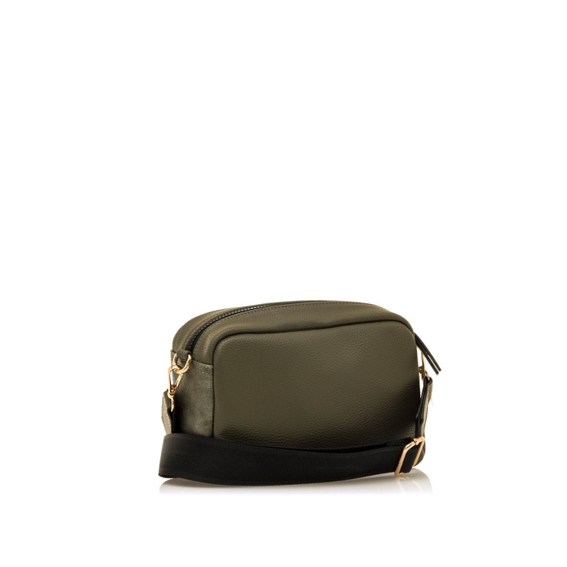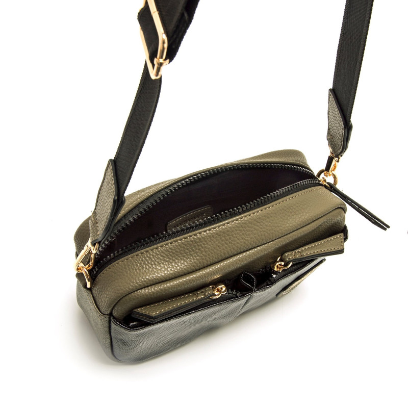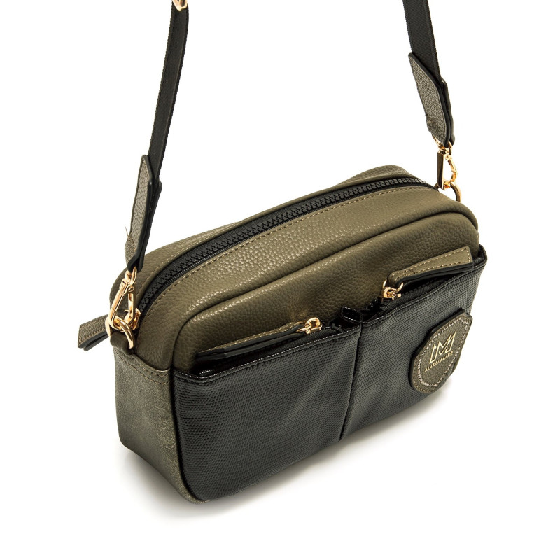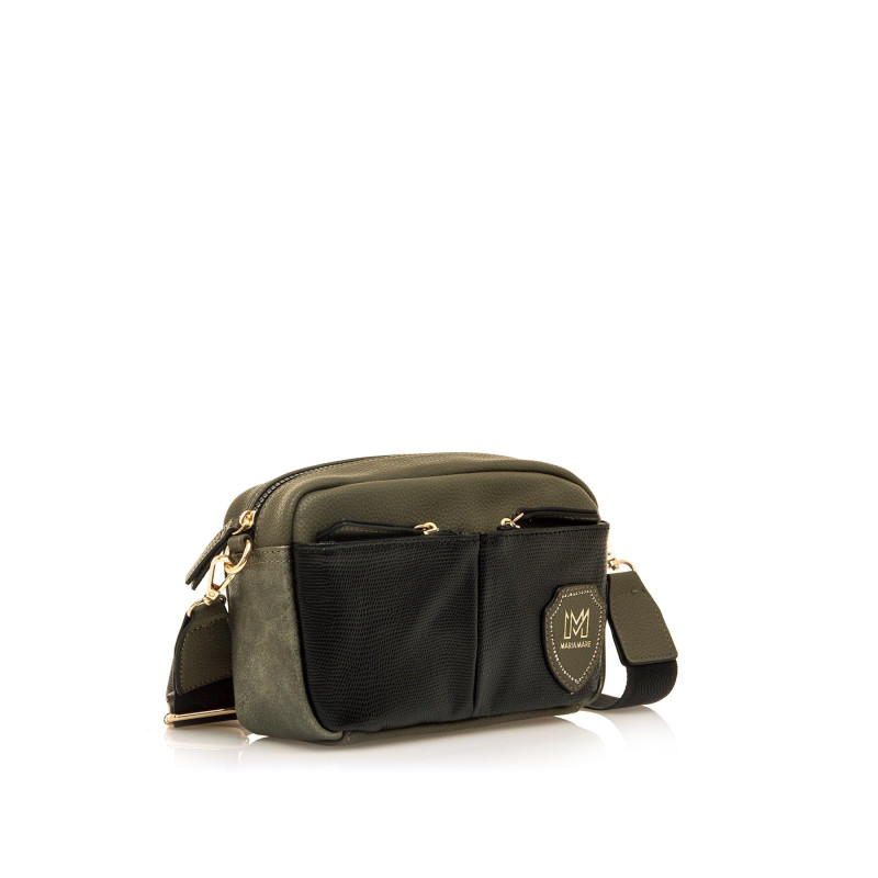 Bolso bandolera para mujer de Mariamare, modelo Nisi con diseño compacto de estilo urbano que combina cuerpo en verde kaki con bolsillos frontales negros texturizados. Su doble bolsillo exterior con cremallera permite organizar fácilmente pequeños ob