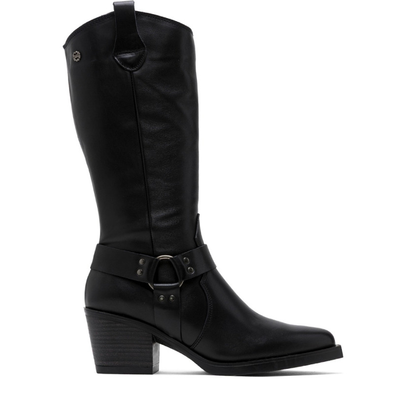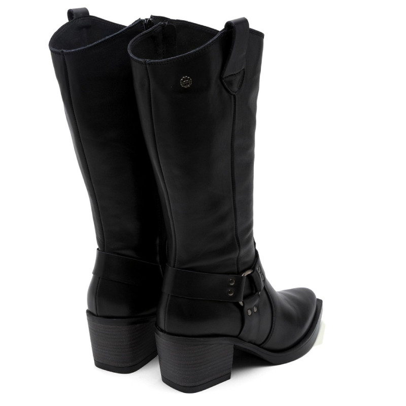 Botas estilo cowboy de piel con aro, tachuelas, tacón de 6,5 cm y plataforma de 1 cm. Apertura lateral con cremallera interior y tiradores laterales para facilitar el calce. Plantilla y forro de microfibra con acabado confort aterciopelado. Piso antidesli