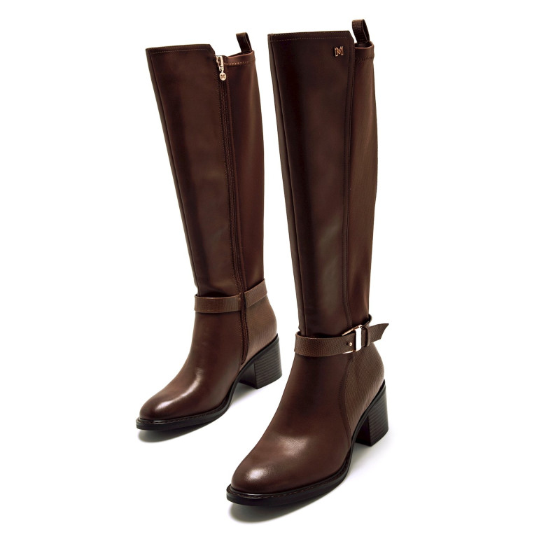 Bota de caña alta de color marrón para mujer, modelo Onore de Mariamare. Este diseño tipo ecuestre combina un acabado liso en la parte frontal con textura grabada en el talón y una caña elástica que se adapta cómodamente a la pierna. Incorpora un cin