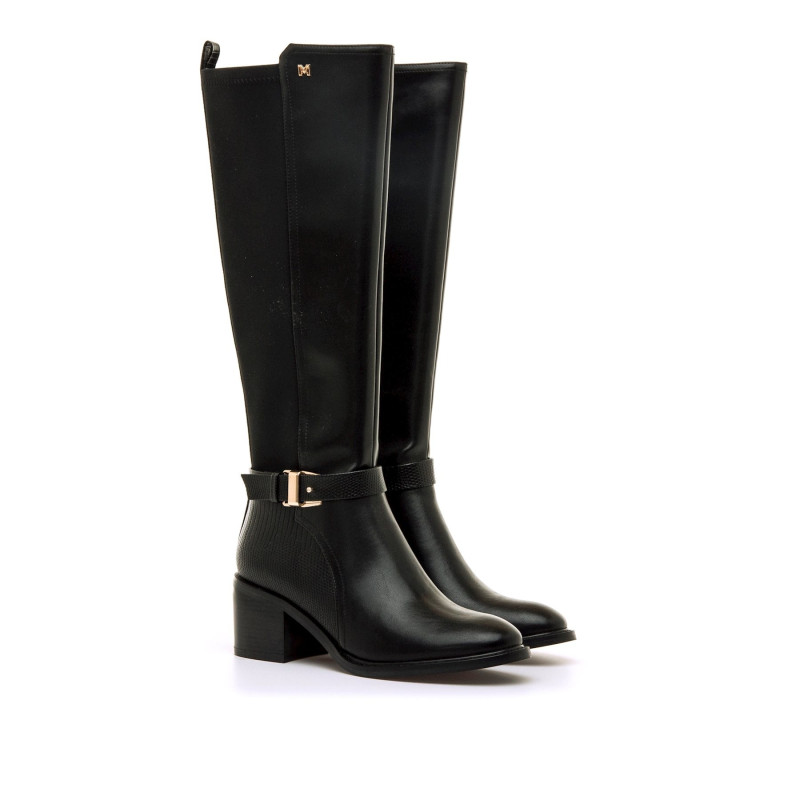 Botas altas de color negro para mujer de Mariamare, modelo Onore. La caña alta estiliza la figura, mientras que la combinación de texturas en el talón y la hebilla dorada lateral añaden un toque distintivo. Su tacón ancho brinda estabilidad y comodid