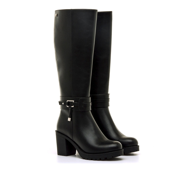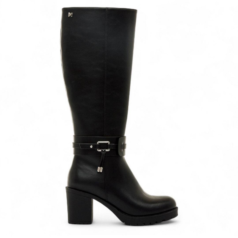 Bota de tacón de color negro para mujer, modelo Pompei de Mariamare con diseño robusto y tacón ancho que ofrece buena estabilidad para el uso diario. Incluye una tira decorativa con hebilla metálica en el tobillo y detalles colgantes que aportan pers