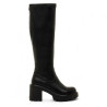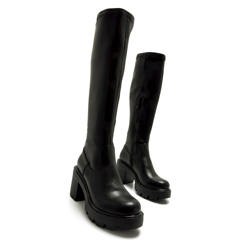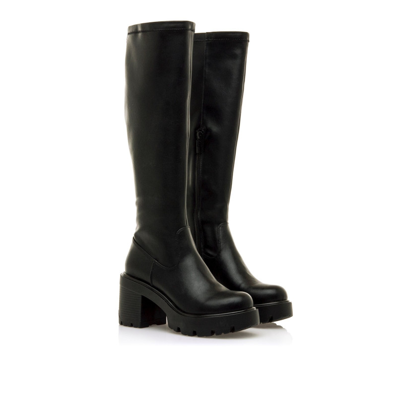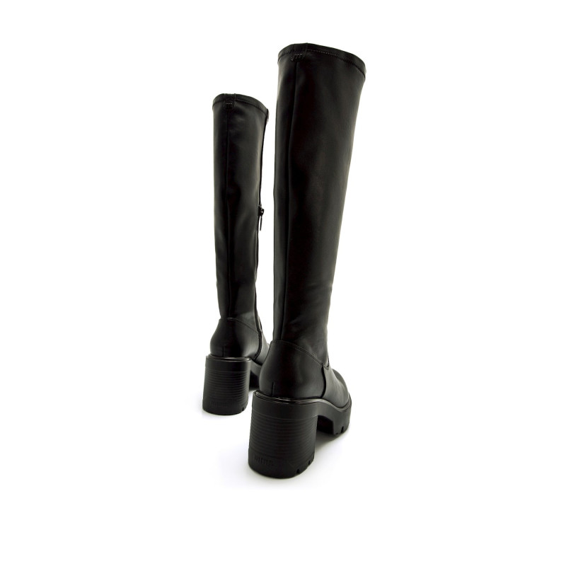 Botas altas para mujer de la marca Mtng, modelo Saba de color negro. Estas botas destacan por su diseño moderno con tacón ancho y plataforma delantera que aporta comodidad y estilo. El cierre lateral con cremallera facilita el ajuste, mientras que su