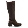 Bota de tacón de color moka para mujer, modelo Maya de MTNG. Su diseño de caña alta y líneas limpias incorpora un panel elástico en el lateral que aporta ajuste y confort. La suela dentada y el tacón ancho añaden estabilidad y un extra de altura, sie