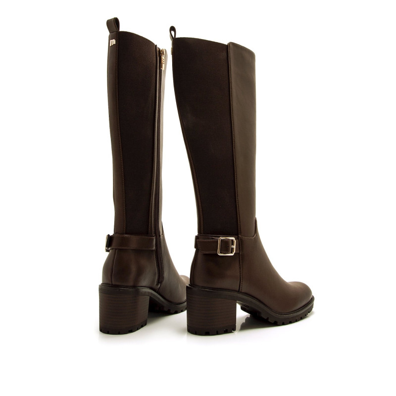 Bota alta de color moka para mujer de la marca MTNG, modelo Maya de estilo urbano con toques ecuestres. Cuenta con caña elástica en la parte trasera que favorece el ajuste a la pierna, mientras que la hebilla metálica lateral añade un detalle funcion