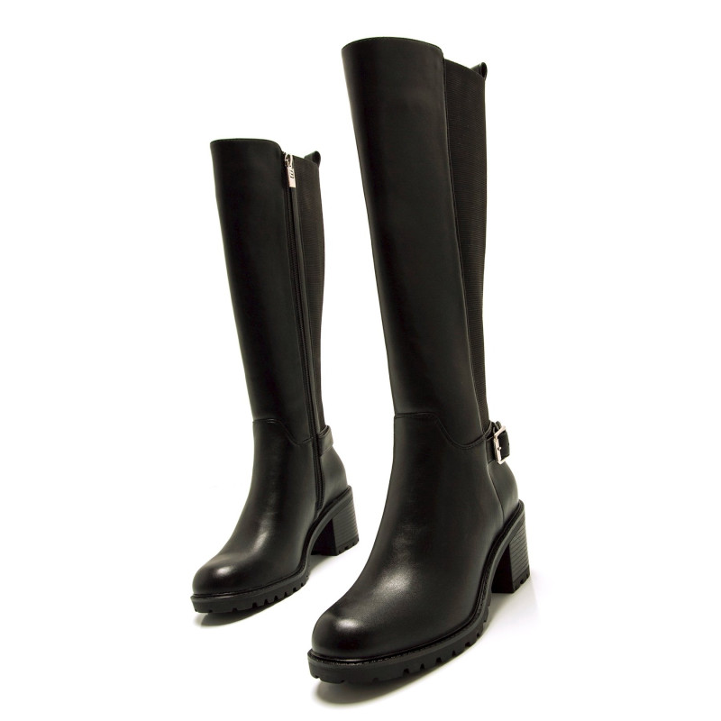 Botas de tacón de color negro para mujer, modelo Maya de Mtng de estilo urbano con inspiración ecuestre. Diseñada con caña alta lisa y elástica en la parte trasera para un mejor ajuste, incluye una hebilla metálica plateada decorativa en el lateral q