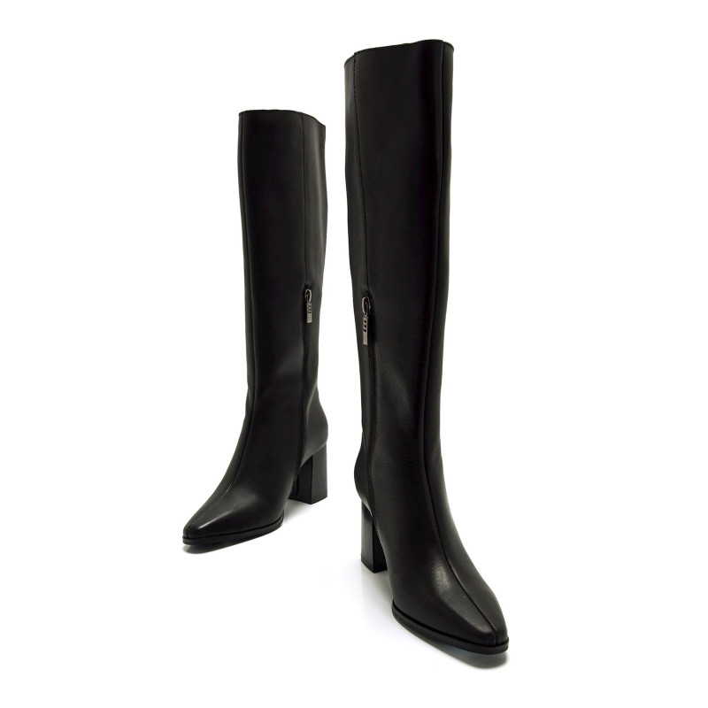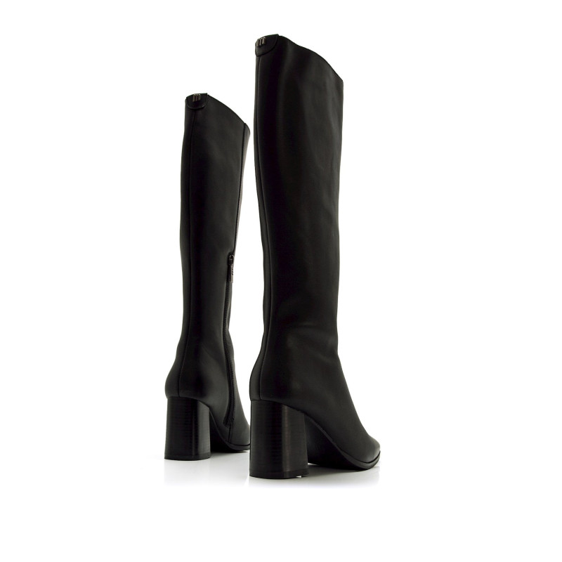 Bota alta de tacón de color negro para mujer, modelo Meghan de Mtng. Su diseño limpio y ajustado alinea con una estética contemporánea, destacando por su puntera fina y el tacón ancho alto que alarga visualmente la pierna. Un modelo versátil y atempo