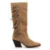 Bota cowboy de serraje de color marrón claro para mujer, modelo Missouri de la marca Mtng. Su diseño de caña alta con tacón ancho inclinado aporta estabilidad y un toque desenfadado, mientras que su tono taupe y los flecos laterales añaden movimiento