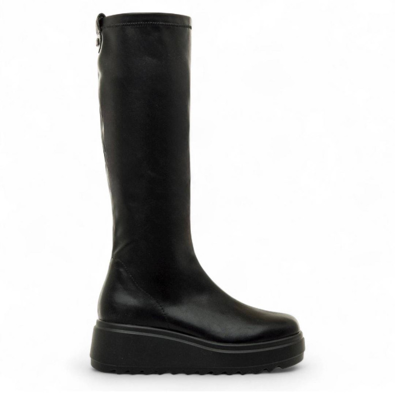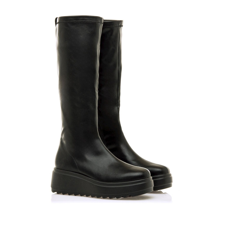 Bota alta de color negro para mujer de la marca Mtng, modelo Nolia con diseño tipo stretch y plataforma dentada. Su estructura lisa de caña alta se adapta a la pierna, mientras que la suela con volumen aporta altura sin comprometer la comodidad. Incl