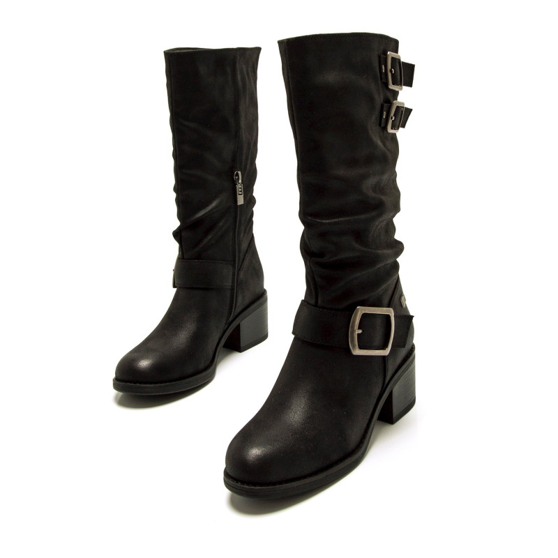 Botas negras de estilo biker para mujer, modelo Persea H de la marca MTNG. Diseñada con caña media y un acabado arrugado, incorpora tres hebillas metálicas decorativas que refuerzan su carácter urbano y desenfadado. El cierre lateral con cremallera f