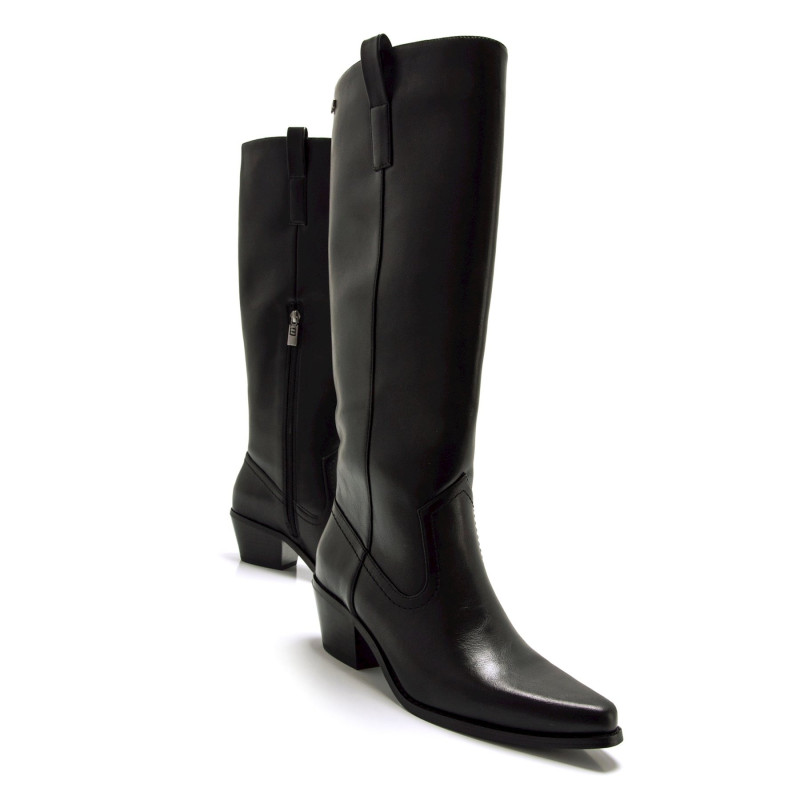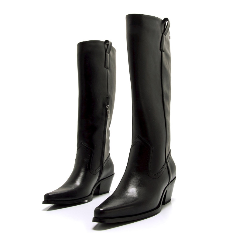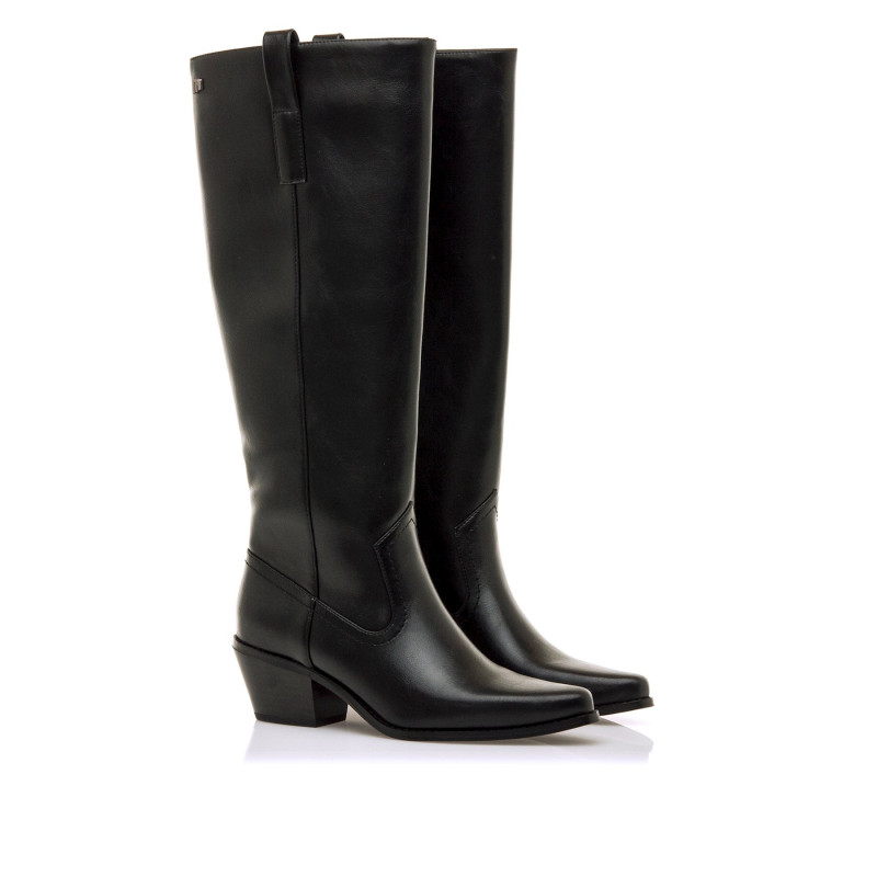 Botas cowboy altas de mujer de la marca Mtng, modelo Texas de color negro. Este diseño inspirado en el estilo western destaca por su puntera afilada y un tacón bajo que asegura comodidad sin perder estilo. Su caña alta con costuras decorativas realza