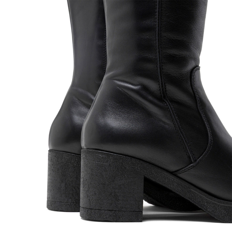 Botas de piel con tacón de 6,5 cm y plataforma de 2,5 cm con detalle de correa y hebilla. Cremallera interior para facilitar el calce. Plantilla y forro de microfibra con acabado confort aterciopelado. Piso antideslizante y flexible. Elaborados 100% en Es