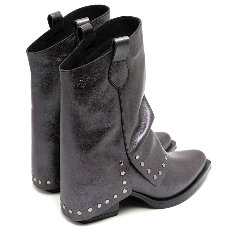 Botas estilo cowboy con doble faz de piel, adornadas con tachuelas metálicas. Tacón de 6,5 cm y plataforma de 1 cm. Tiradores laterales para facilitar el calce. Plantilla y forro de microfibra con acabado confort aterciopelado. Piso antideslizante y flexi