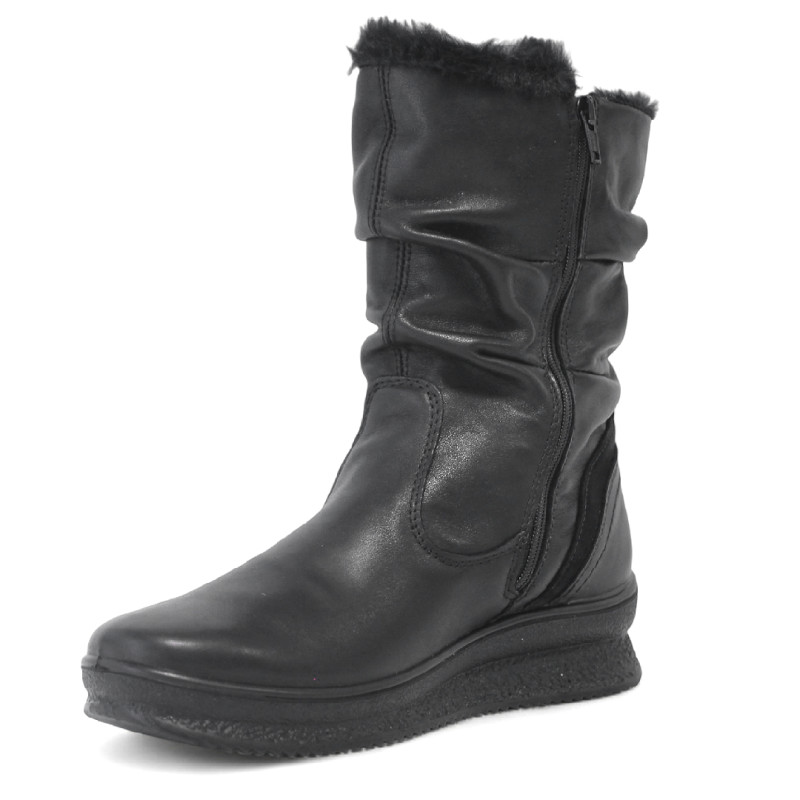 Botas planas para mujer Imac en color negro, confeccionadas en piel de alta calidad. Presentan caña arrugada y forro interior de pelito que aporta calidez y comodidad. Incorporan cremallera lateral para un calce fácil y rápido, y un panel de ante decorativo que añade un toque moderno al diseño de piel lisa. Perfectas para un look urbano y elegante durante la temporada de frío.