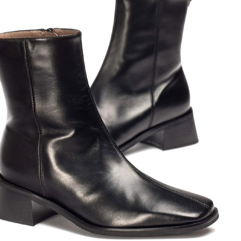 Botines AYLA 01 confeccionadas en piel lisa negra. Este modelo destaca por su silueta elegante y minimalista, que estiliza el pie con un efecto sofisticado. Incorpora cierre lateral mediante cremallera para un ajuste cómodo y rápido. El tacón de altura me
