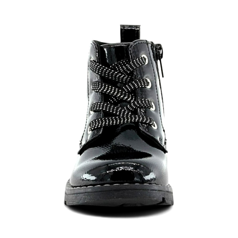 Botines planos para niña de la marca Chicco modelo Flemma en color negro, con efecto charol y parche textil con estrella que aporta un detalle divertido y moderno. Su estilo militar combina tendencia y funcionalidad, ideal para las más pequeñas que buscan calzado resistente y cómodo. Cuentan con cierre mediante cordones y cremallera lateral, facilitando un calce rápido y seguro. Fabricados con materiales de calidad, estos botines proporcionan flexibilidad y soporte en cada paso, perfectos para el día a día y ocasiones casuales.