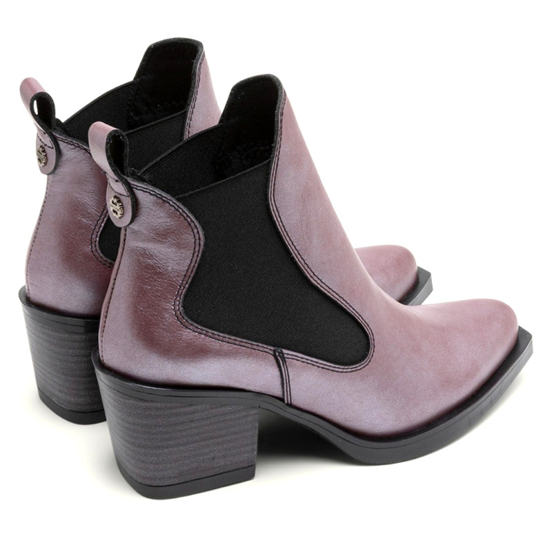 Botines estilo cowboy de piel con acabado metalizado, tacón de 6,5 cm y plataforma de 1 cm. Elásticos laterales y tirador trasero para facilitar el calce. Plantilla y forro de microfibra con acabado confort aterciopelado. Piso antideslizante y flexible. E
