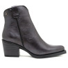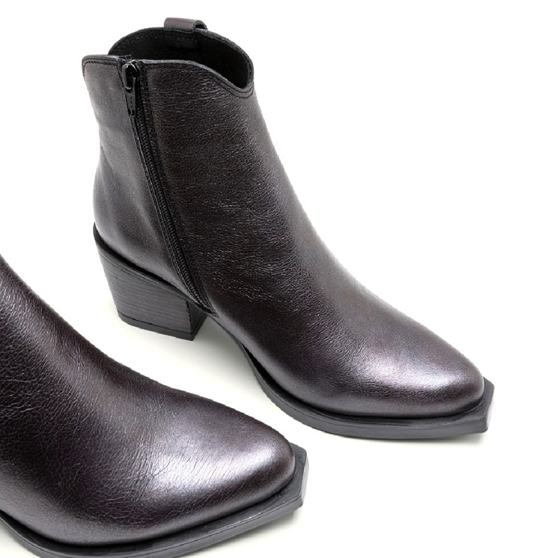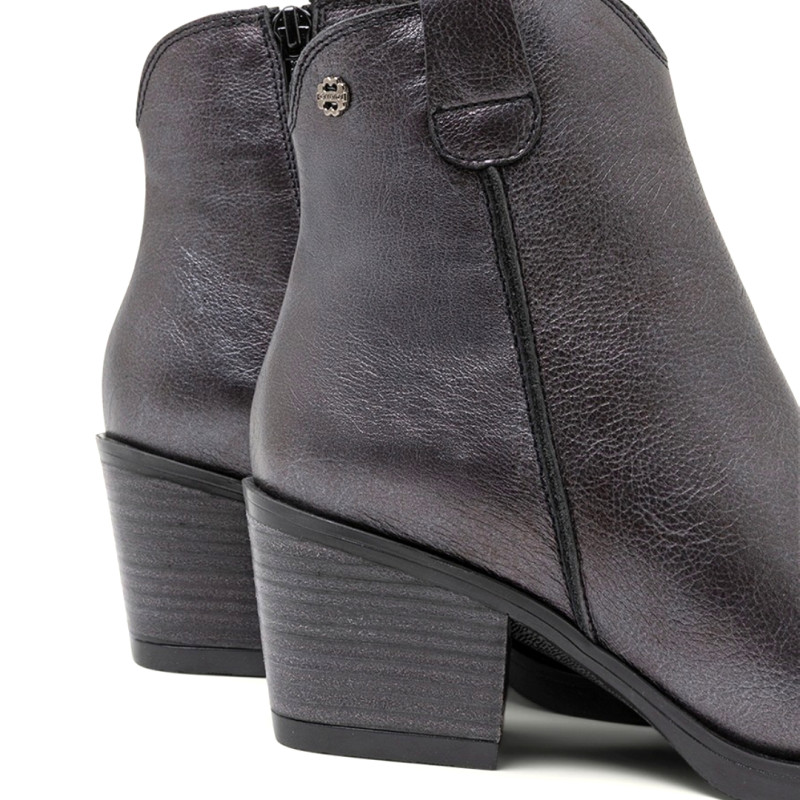 Botines estilo cowboy de piel con acabado metalizado, tacón de 6,5 cm y plataforma de 1 cm. Apertura lateral con cremallera interior y tiradores laterales para facilitar el calce. Plantilla y forro de microfibra con acabado confort aterciopelado. Piso ant