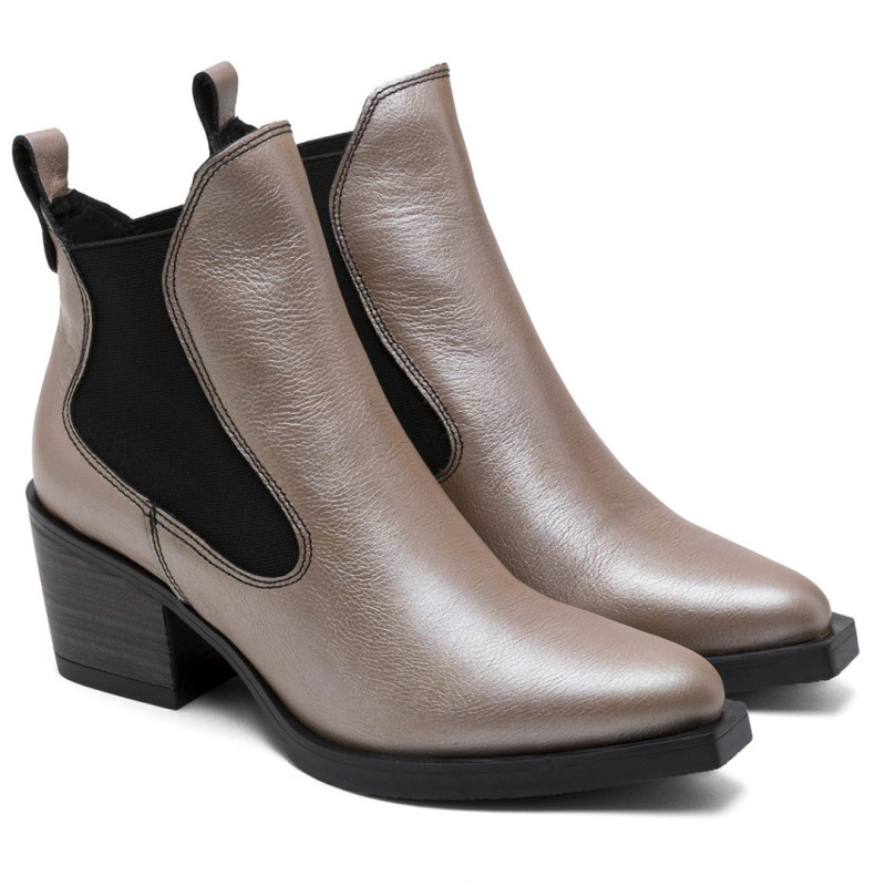 Botines estilo cowboy de piel con acabado metalizado, tacón de 6,5 cm y plataforma de 1 cm. Elásticos laterales y tirador trasero para facilitar el calce. Plantilla y forro de microfibra con acabado confort aterciopelado. Piso antideslizante y flexible. E