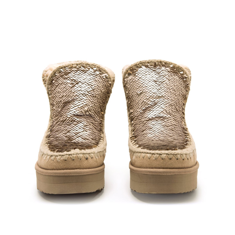 Botín de color beige para mujer de Mariamare, modelo Miara estilo apreski. Este diseño combina un exterior con lentejuelas plateadas en la parte frontal y detalles de costuras visibles que le dan un toque artesanal y llamativo. El interior está forra