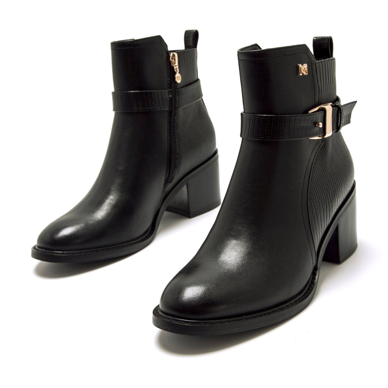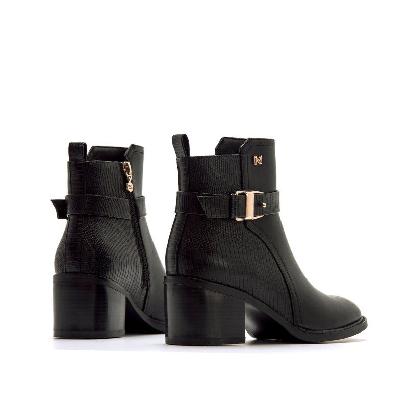 Botines para mujer de Mariamare, modelo Onore de color negro. Su diseño combina una textura lisa en la parte delantera con un acabado texturizado en el talón, aportando contraste y estilo. La hebilla dorada decorativa en el lateral y el logo metálico