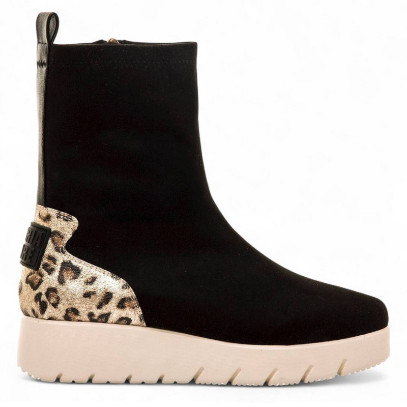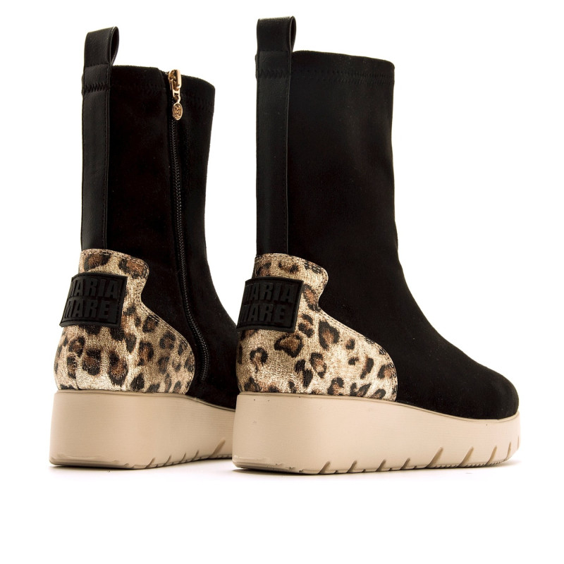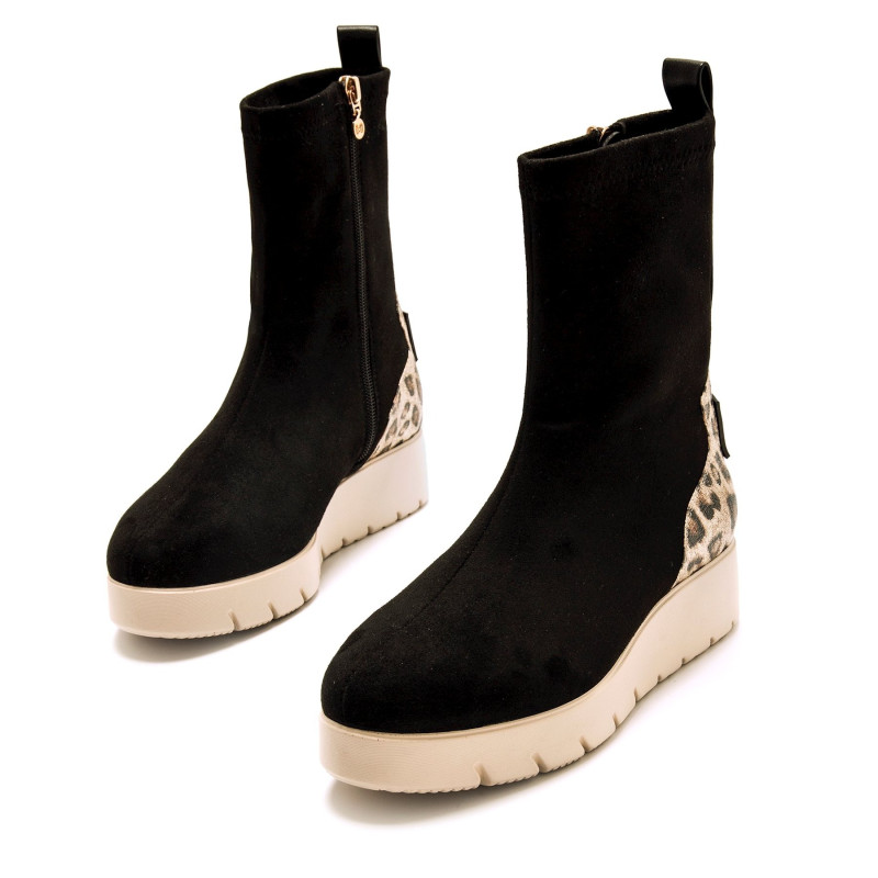 Botines de color negro para mujer de Mariamare, modelo Burano de estilo casual con suela de plataforma. Su diseño combina un acabado aterciopelado con un detalle de animal print de leopardo en el talón, que añade un toque original. La suela gruesa de
