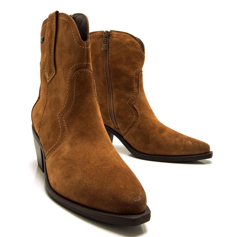 Botines cowboy de piel para mujer, modelo Daphne Mtng de color roble. Con un diseño que destaca por sus líneas decorativas en contraste y su acabado en serraje suave, este modelo aporta un aire rústico y versátil. Incorpora cremallera lateral para un