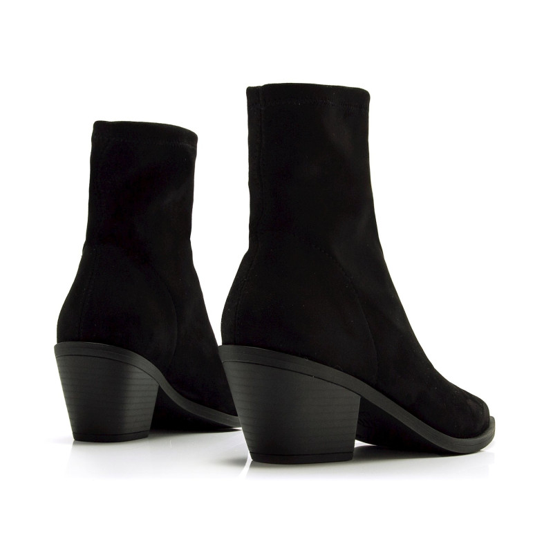 Botín stretch de color negro para mujer de la marca Mtng, modelo Daphne con detalles cowboy. Su diseño sobrio en microfibra ofrece una silueta afilada y ajustada al tobillo, ideal para combinar con jeans o vestidos midi. El tacón medio ancho proporci