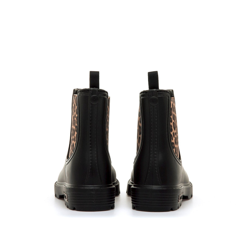 Botines de agua planos de color negro para mujer, modelo Halo de Mtng. Este diseño tipo chelsea incorpora paneles laterales elásticos con estampado de leopardo, que aportan un toque llamativo y actual. Su suela con relieve lo convierte en una opción