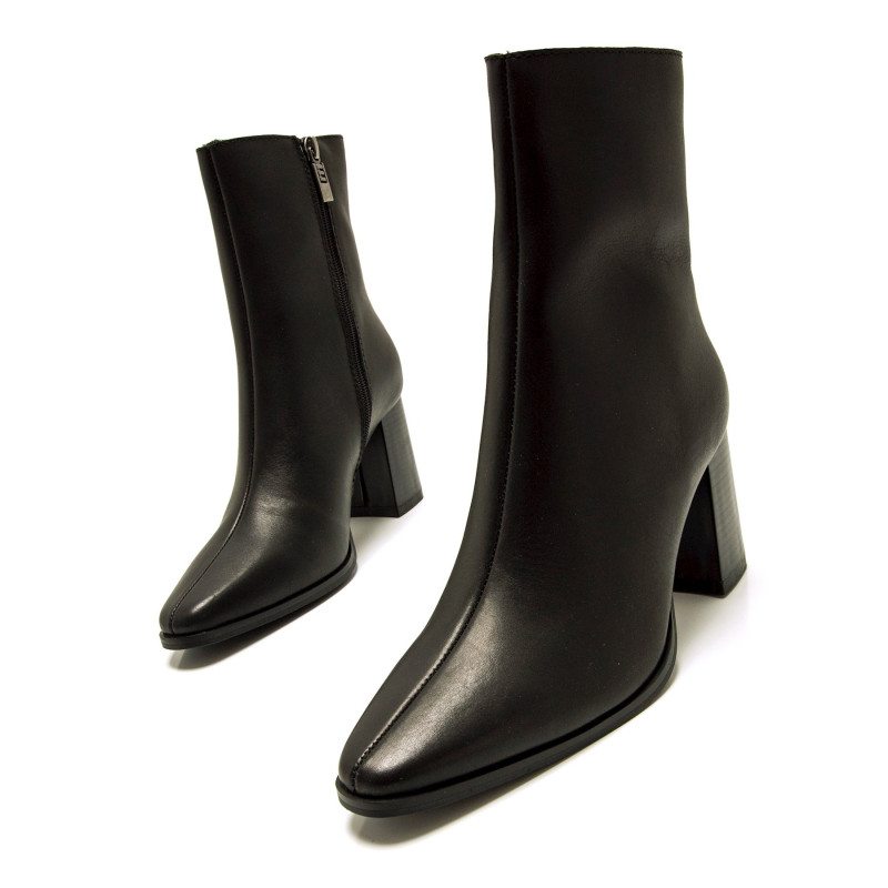 Botín de color negro para mujer, modelo Meghan de la marca Mtng. Su diseño estilizado y limpio se adapta con facilidad a looks urbanos o más formales. La puntera fina y el tacón alto ancho alargan visualmente la pierna, mientras que el acabado liso a