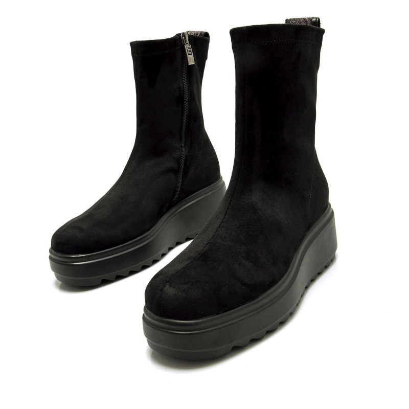 Botines negros para mujer de la marca Mtng, modelo Nolia con acabado afelpado. Su diseño liso tipo stretch se combina con una plataforma gruesa dentada que aporta comodidad y un look actual. Incluye cremallera interior para facilitar el calce y tirad