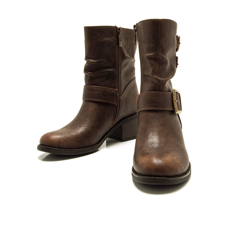 Botín de color cuero para mujer de la marca MTNG, modelo Persea de estilo biker. Con una caña baja arrugada y decorado con dos hebillas metálicas doradas en la parte superior y otra al tobillo, este diseño ofrece un look robusto y funcional. El tacón