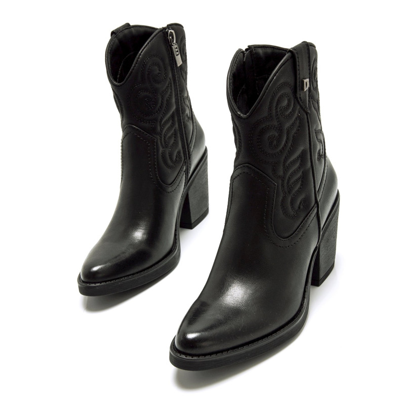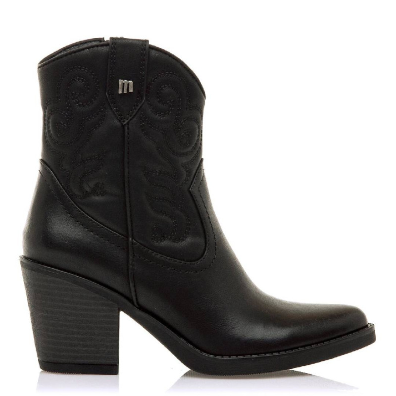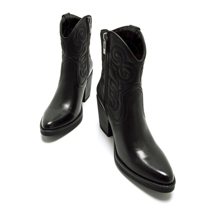 Botines de tacón de color negro para mujer, modelo Tijuana de Mtng. Su diseño de estilo cowboy con tacón ancho y bordado decorativo en la caña resaltan su inspiración western. Incluye puntera afilada y cierre lateral con cremallera para facilitar el