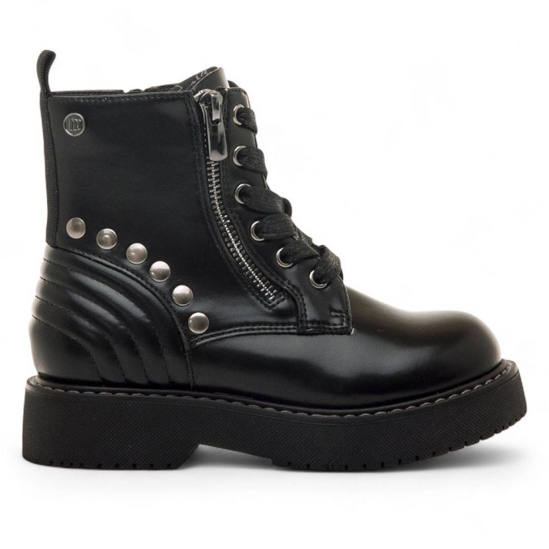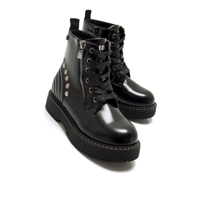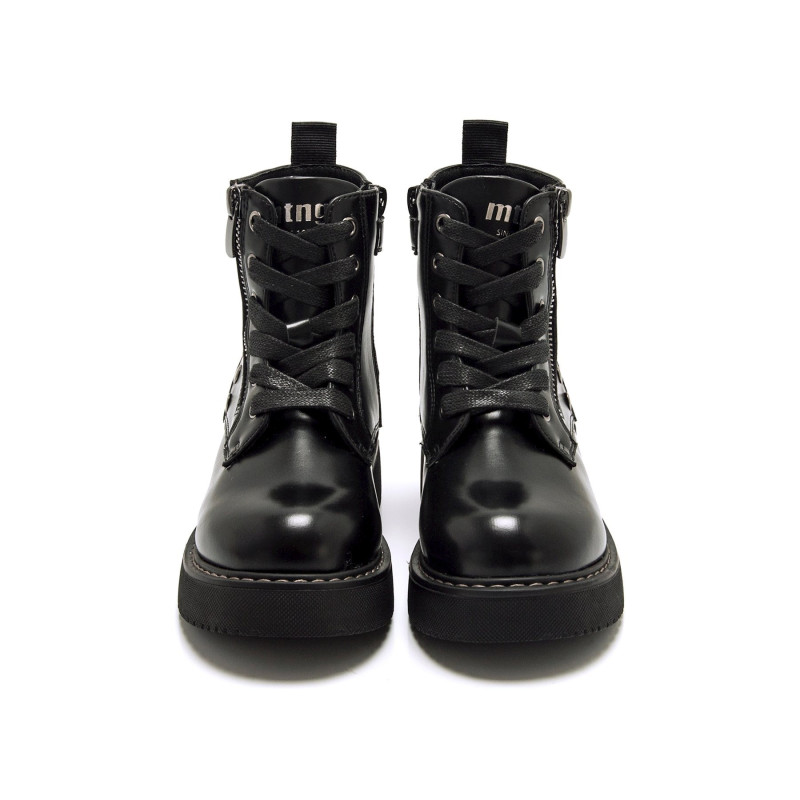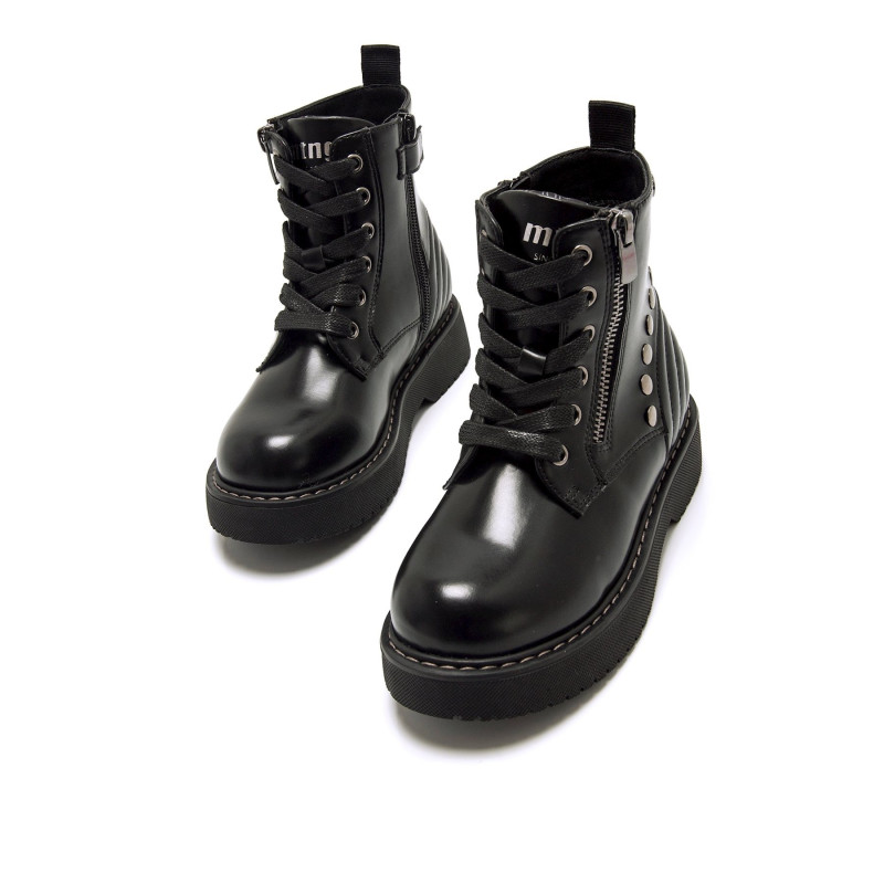 Botín de color negro para niña modelo Storm High de MTNG. Este diseño de estilo militar destaca por su estética urbana con toques decorativos en el lateral, incluyendo tachuelas metálicas que aportan personalidad y una cremallera frontal. El cierre c
