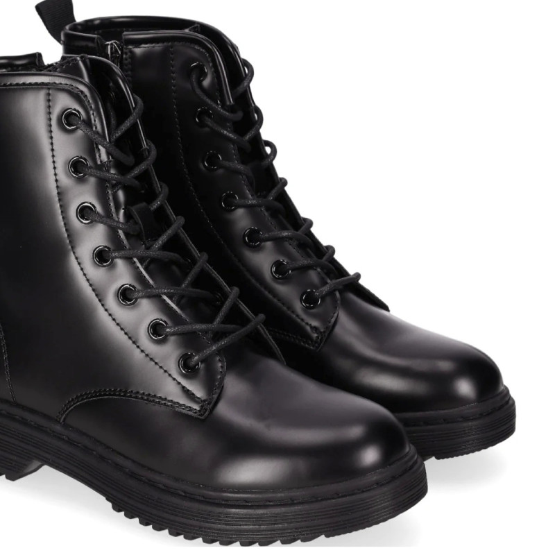 Los botines de caña media con suela plana combinan estilo, confort y resistencia en un diseño moderno y urbano. Fabricados en piel vegana, destacan por su robustez y estética de estilo militar, ofreciendo un calzado versátil y sofisticado para cualquier ocasión. Su acabado pulido en polipiel lisa aporta un toque elegante y cuidado, mientras que el cierre con cordones permite un ajuste perfecto y seguro. La suela plana garantiza estabilidad y comodidad durante todo el día, convirtiendo estos botines en una opción ideal tanto para el día a día como para recorridos urbanos o terrenos variados. Perfectos para combinar con jeans, pantalones cargo o looks casuales con estilo, estos botines de caña media aportan un carácter distintivo y moderno a cualquier outfit, sin renunciar a la comodidad ni al diseño sofisticado.