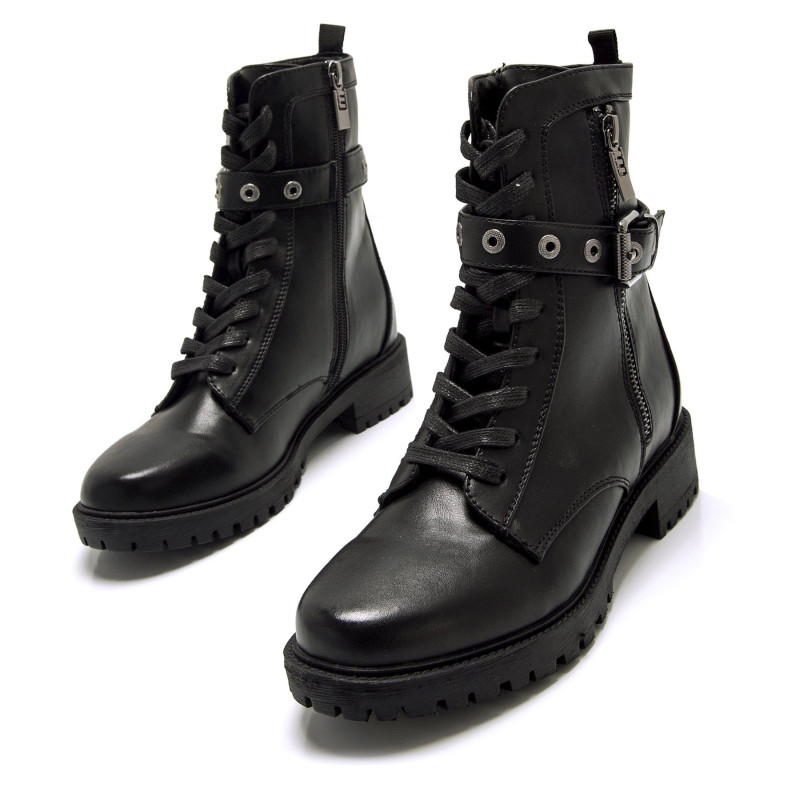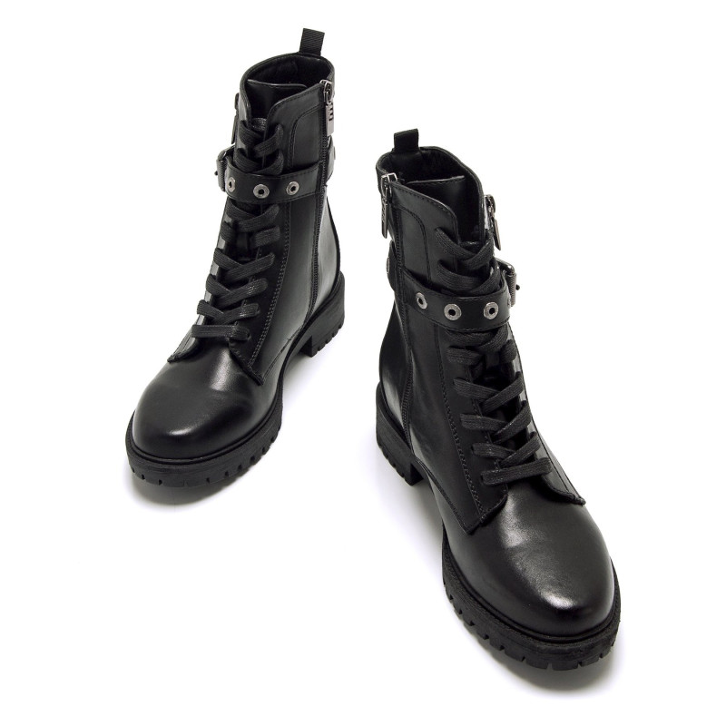 Botines planos Mustang campa negras con detalles metálicos y correa en la hebilla
