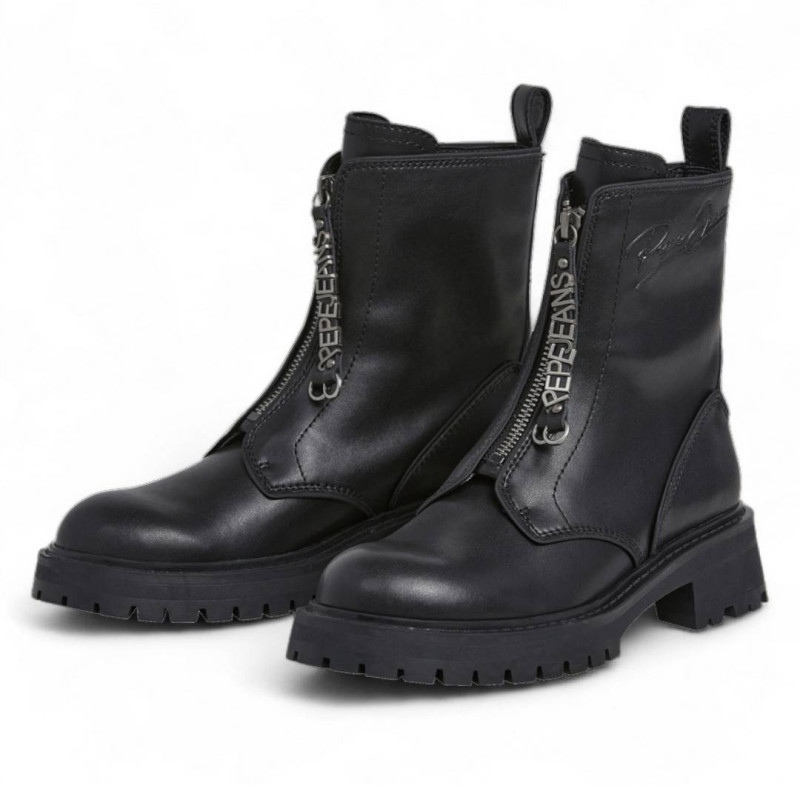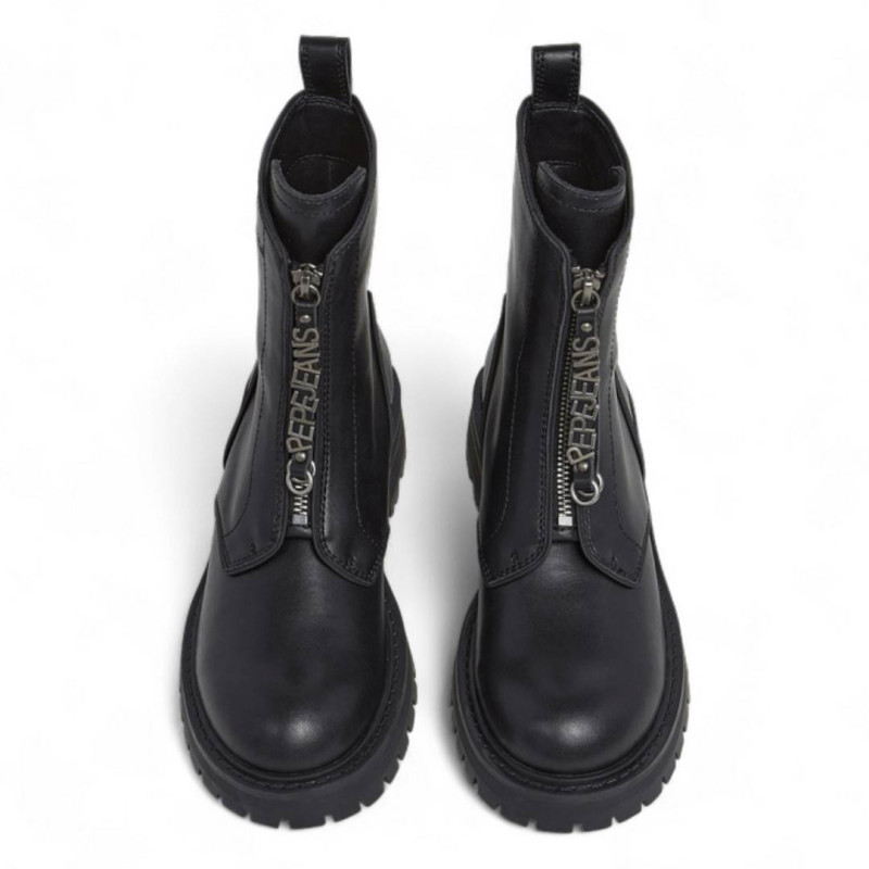 Botines planos para mujer de la marca Pepe Jeans, modelo Stacy Hug en color negro. Este diseño moderno y funcional destaca por su cremallera frontal en el empeine, adornada con un tirador con el nombre de la marca, que aporta un toque distintivo y contemporáneo. Fabricados en piel de alta calidad, garantizan durabilidad, suavidad y un ajuste cómodo. Su suela plana proporciona confort durante todo el día, convirtiéndolos en el calzado perfecto para combinar con cualquier look urbano o casual.